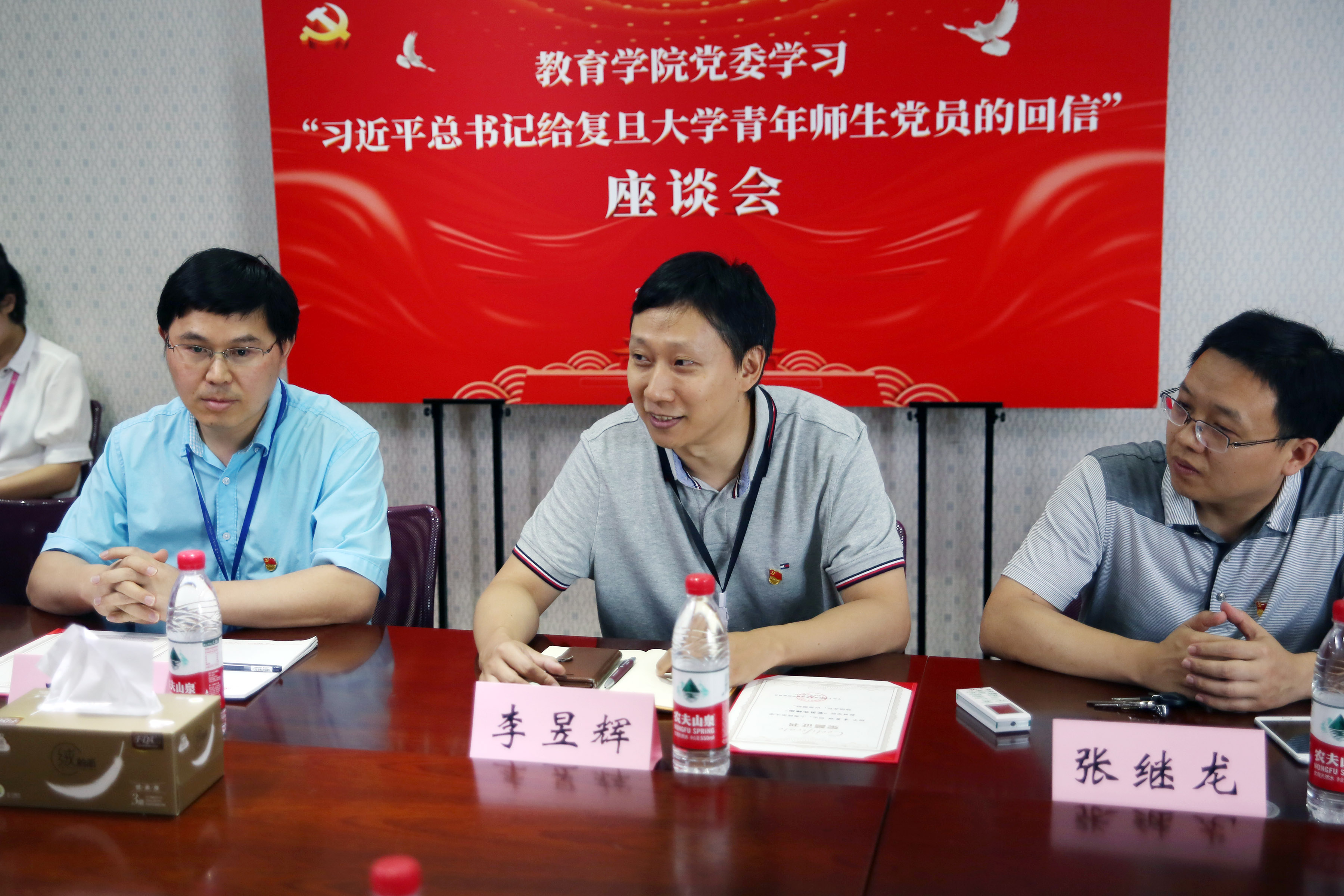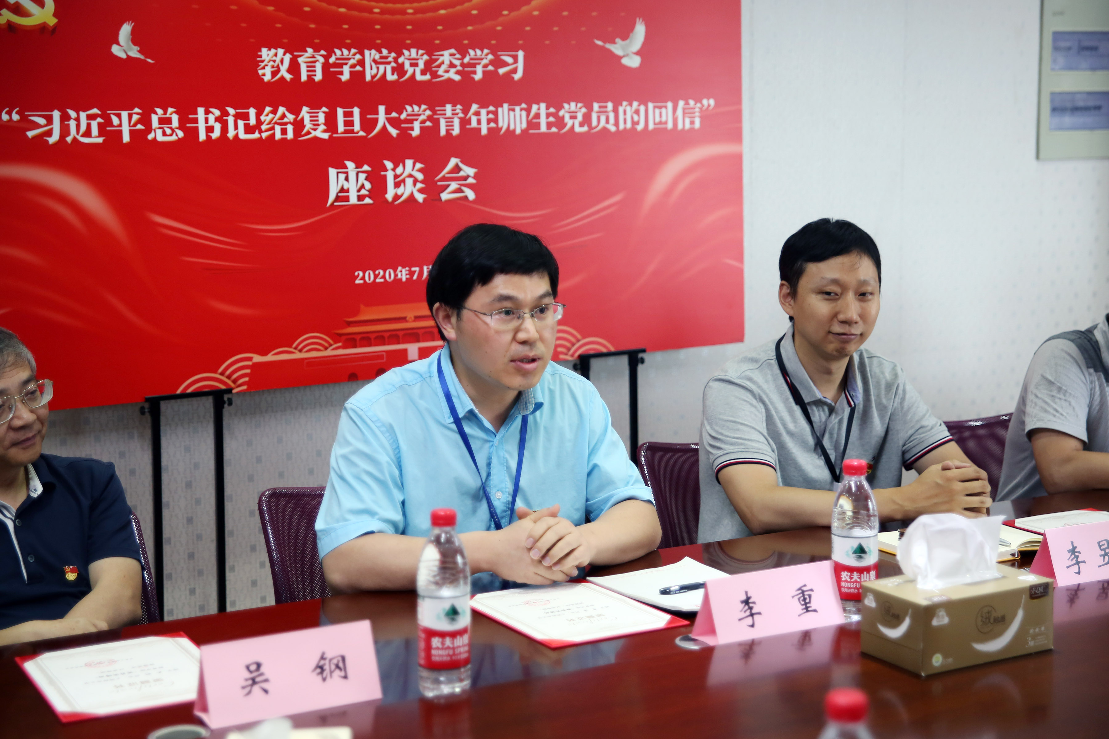 7月6日下午,教育学院党委学习“习近平总书记给复旦大学青年师生党员的回信”座谈会在教苑楼A座704会议室召开。院党委书记徐晓明,院长、院党委副书记夏惠贤,院党委副书记王健,全体教工党支部书记以及2020年度学校、学院党员先锋岗教师出席座谈会。