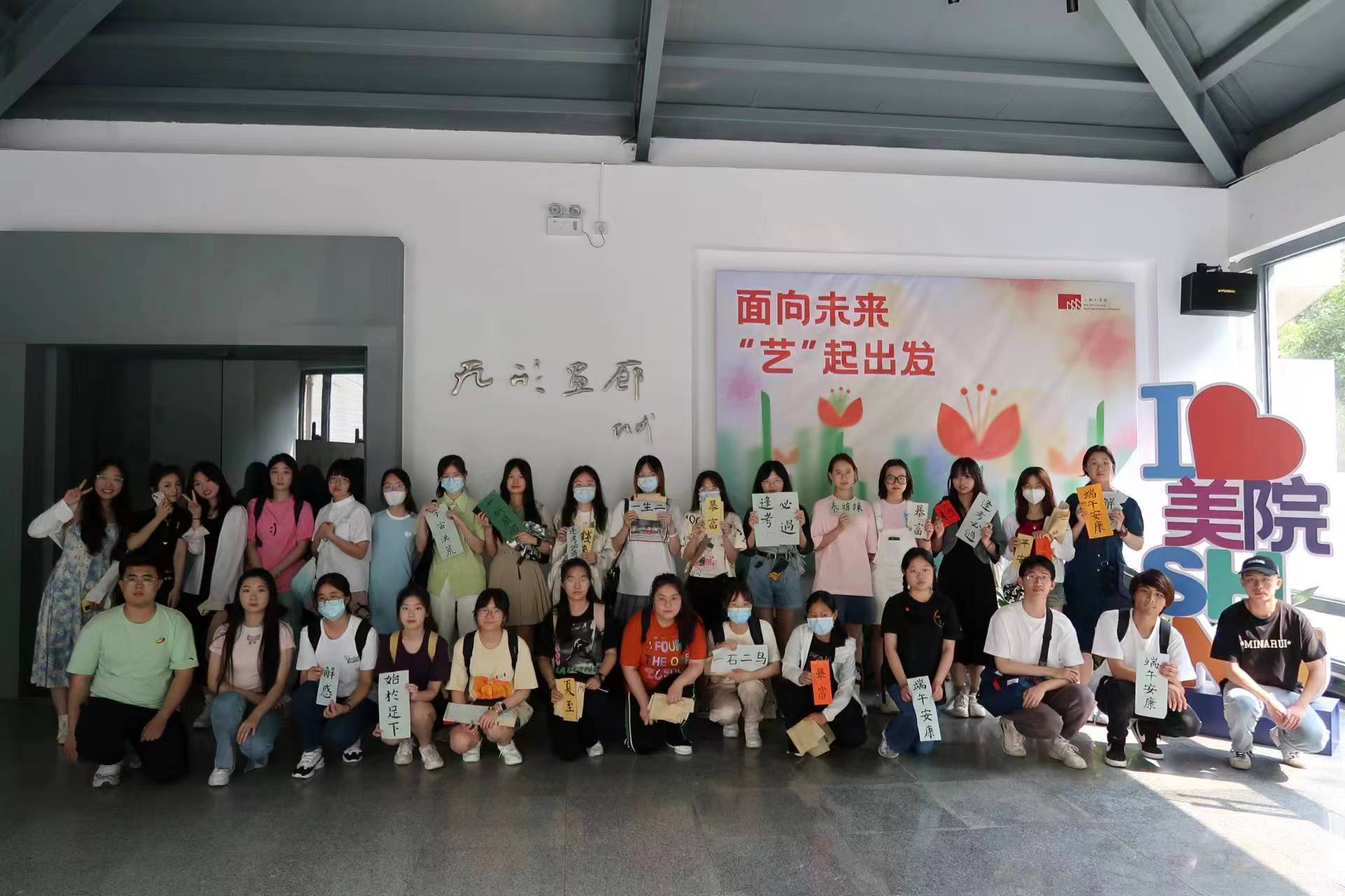 活动最后,教育学专业学生们手举自己写下的书法作品和书法专业21级学生以及两位指导老师在美术学院拍照留影,为这一次专业合作共建活动画下圆满句号。
