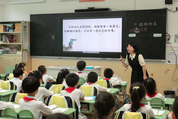 2022级小学教育专业硕士研究生程丽娟展示了小学语文三年级课程《搭船的鸟》的教学。程丽娟同学以“观察”为教学线索,通过放映视频、提问交流、领读齐读等方式与学生互动,有意识地将写作的方法指导渗透在阅读教学之中,借助文本,联系生活,引导学生形成留心观察的意识,掌握细致观察与描写的方法。2020级小学教育专业本科生莫丽豆·加那提展示了小学语文二年级课程《坐井观天》的教学。莫丽豆同学针对二年级学生的思维发展特点,通过分角色朗读等多种教学方法,让学生在小鸟与青蛙的争论中理解故事中传达的寓意。