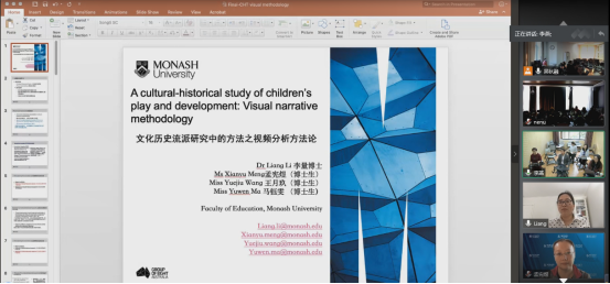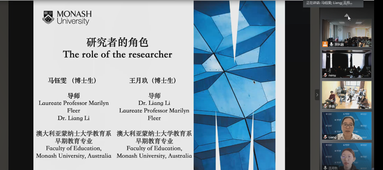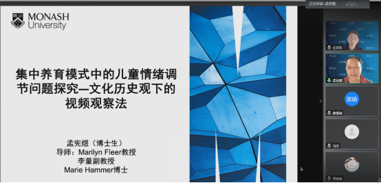 莫纳什大学博士生孟宪煜用自己所做的研究来具体介绍了视频信息的搜集与整理的过程,展现了她在收集和分析数据时的一些体会和感受,向与会者分享了视频观察法对她的助益,例如能够更深入研究发展的过程、快速捕捉研究对象儿童的瞬间、帮助她发现微妙的变化并帮助她复盘老师与研究员的角色。