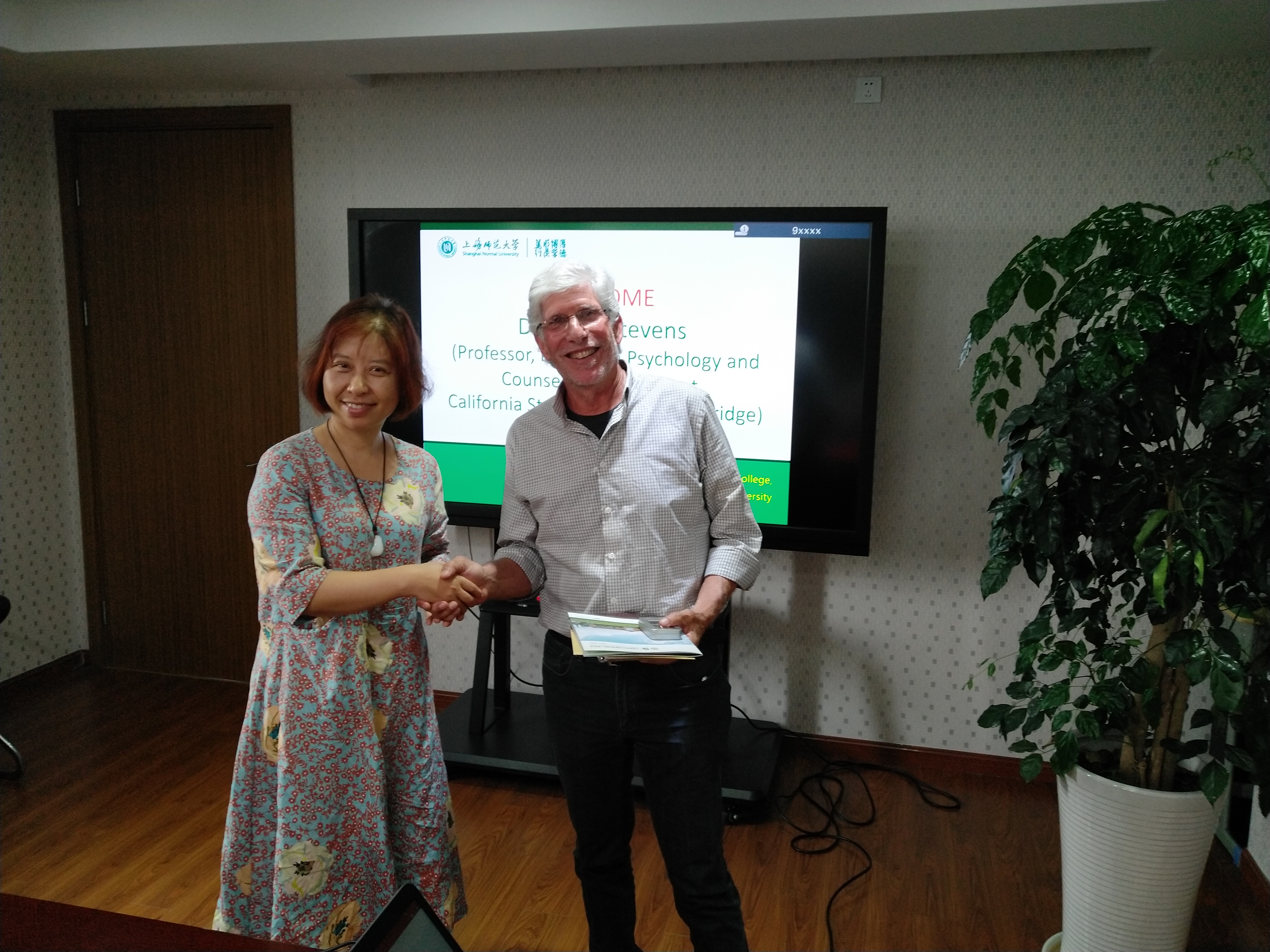 会上,Dr. Stevens就CSUN教育心理学、心理咨询专业的本科教育、研究生教育做了简要介绍。随后蔡丹教授介绍了我院心理系的整体情况、四个研究方向以及本硕博学生教育教学概况。参会的所有教师也介绍了各自的研究兴趣与专长。Stevens教授得知教师们的研究背景,表示出高度的赞赏,认为心理系的师资具有跨学科、跨领域的优势,在研究方法上也展示出了很强的整合特点。随后双方共同表达了强烈的合作意愿,并对未来合作的具体意向,包括师生访学交流、合作研究主题等等方面做了深入的交流。