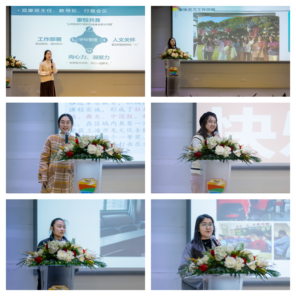 本学期,我院公共事业管理(师范)专业与阳光学校教育集团合作开展为期一周的师范生见习活动。来自该专业的57名二、三年级师范生,在阳光学校教育集团的六所九年一贯制学校进行集中、就近、全方位见习。21级师范生肖晨蕾、倪芸卿、韩王祎、陈璐鹭和22级师范生沈宇琪、萨代提古丽·艾买尔分别代表六个见习小组作见习汇报,分享了各小组在课堂教学、班级管理、教研活动、学校管理等方面的见习收获和感悟,表达了对未来如何做一名好教师、如何做一名好的教育管理者的设想和准备。