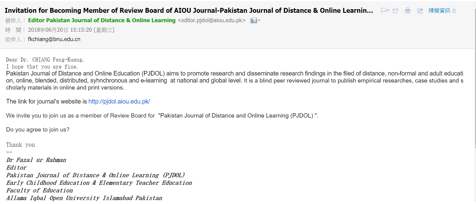 国际教育期刊《巴基斯坦开放教育与在线学习杂志》(PJDOL)Pakistan Journal of Distance and Online Education, (PJDOL), http://pjdol.aiou.edu.pk/ , ISSN: 2415-2013 (Print) ,ISSN: 2415-2021 (Online)于2018年6月邀请江丰光教授担任审稿专家。该杂志(PJDOL)旨在促进全球开放教育与在线学习的国际相关研究,研究议题包含非正式学习和成人教育在线学习、混合学习、分布式学习、同步和数字化学习等领域的研究成果。该杂志是一本由同行盲审的期刊,以在线和印刷版出版相关的实证研究论文、案例研究和学术信息发布等。江丰光教授受邀担任国际评审专家,对于提升我院的国际影响力具有重要的意义。