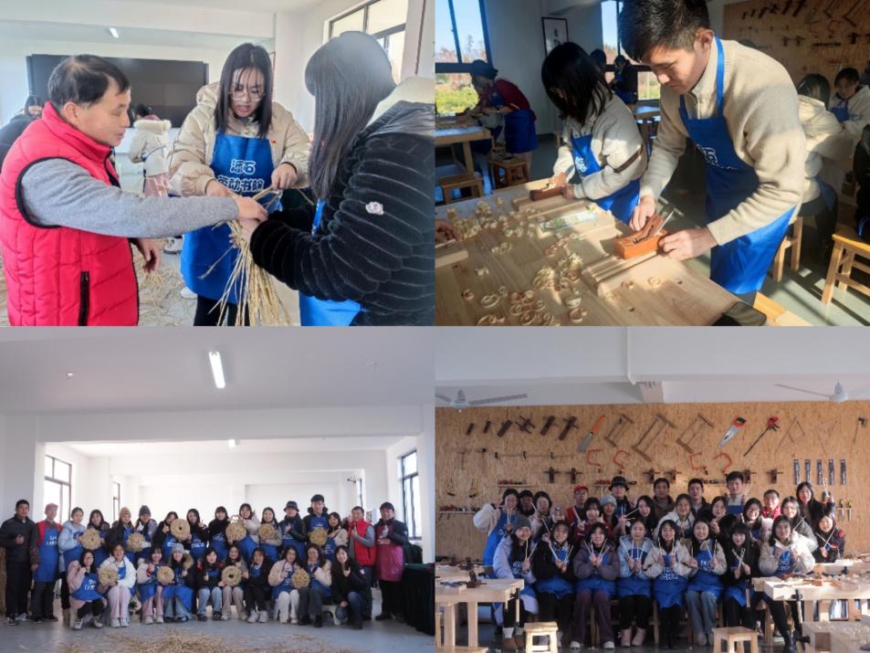 随后,教育学院师生参观了潘石劳动教育实践基地,一同在教育专员的讲解和引导下体验了编草盖和做筷子两节劳动实践课程,并邀请专业团队进行课程录制。老师和学生们戴上围裙,捧起稻草,在一圈圈编织中收获亲手定制的草盖,又拿起刨子,把木条放进模具推出筷子雏形,再用砂纸打磨光滑,亲眼见证木头从粗糙到细腻的全过程,动手体验制作一双筷子的乐趣。