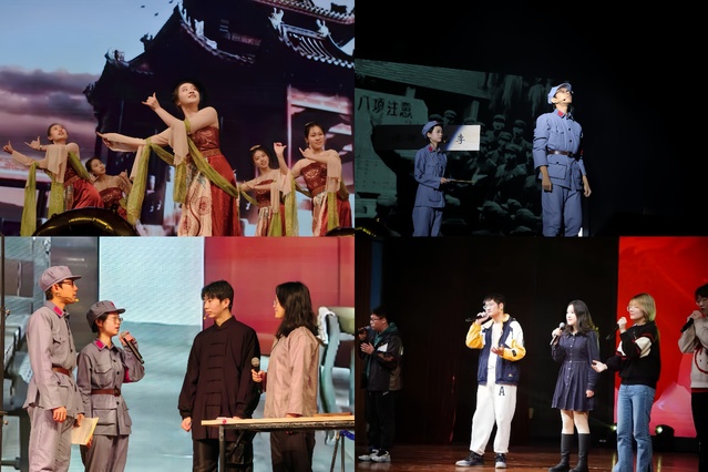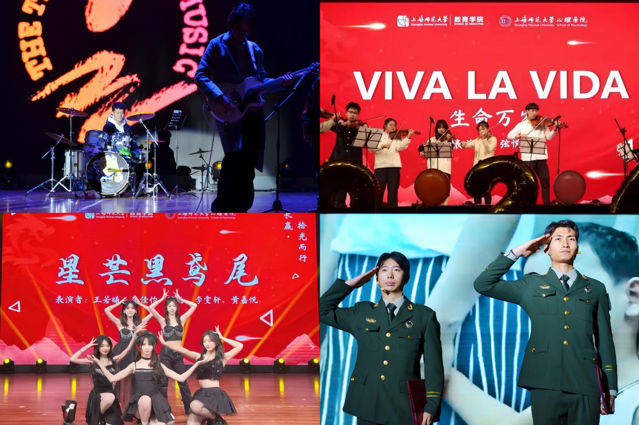 随后音痕乐社带来余韵悠长的乐器合奏;两院本科新生的舞蹈《星芒黑鸢尾》展现了教育学院和心理学院学子的青春活力;弦悦社演奏的《VIVA LA VIDA》借音乐的韵律诠释生命之汹涌澎湃;由学院四位退伍军人带来的诗朗诵《年轻的战场》情绪高昂,字字句句流露着对保卫国家的坚定信念与赤诚忠心。