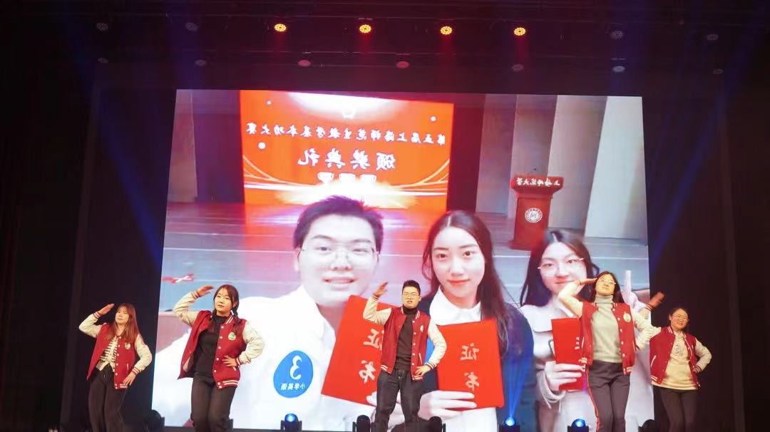 最后,教育学院、心理学院的辅导员们携手共唱,用歌声带着冬日温暖与同学们结伴而行;教育学院学生会部门负责人、主席团从幕后来到台前,带领观众乘上童年时光机,通过充满童真的歌舞表演,在欢乐中尽显青春风采。晚会也在欢声笑语中落下帷幕。