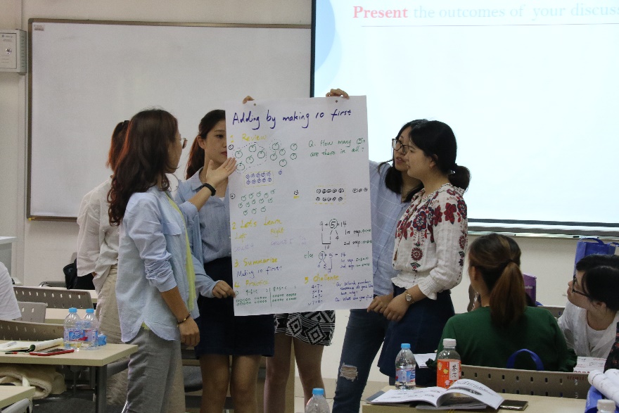 此次培训会不仅为上海数学教师准备了专业讲座,夯实理论基础,还提供了丰富的模拟环节,进行实战训练。培训期间张民选、顾泠沅、李士锜、王蓉华、黄华、姚剑强、曹培英、潘小明、程慧、黄琰等一批沪上专家,或介绍了上海中小学数学教学经验与特色,或分享了国际学校数学教学的经验和英国数学教学经验。参加培训的陈懿懿、朱一夫等多名中小学数学老师,用全英文进行现场教学模拟展示,为教师提供了相互切磋的交流平台。同时,项目组借助英文版的上海数学教材,为参加交流的上海数学教师,分组开展了4次工作坊,帮助教师熟悉英语环境下的数学教学。