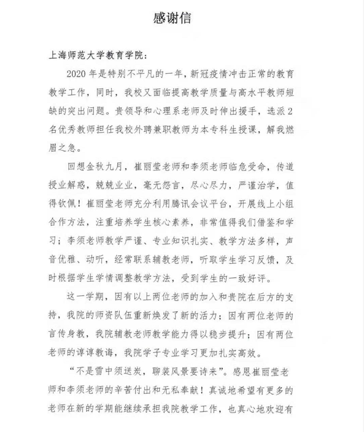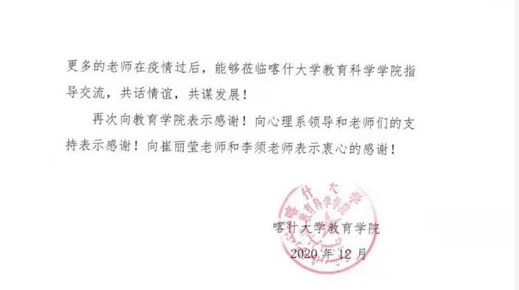 近日,教育学院收到喀什大学教育科学学院感谢函,对学院心理学系崔丽莹副教授,青年教师李须博士表示感谢。