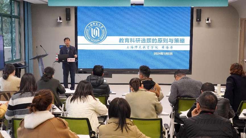 开班仪式结束后,黄海涛教授为学员们做《教育科研选题的原则与策略》主题报告,其系统的方法介绍、丰富的经验举例和生动的讲课形式赢得了学员们的广泛好评。