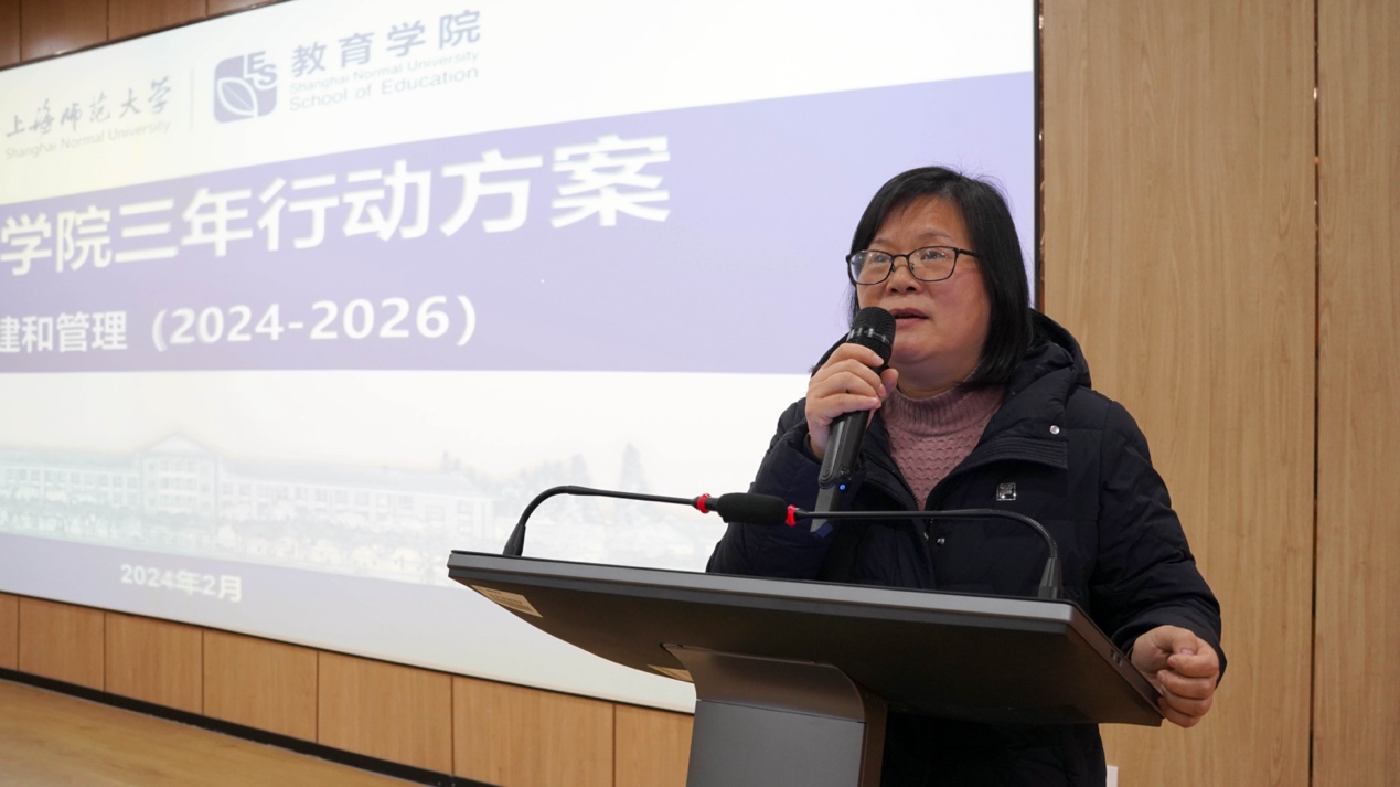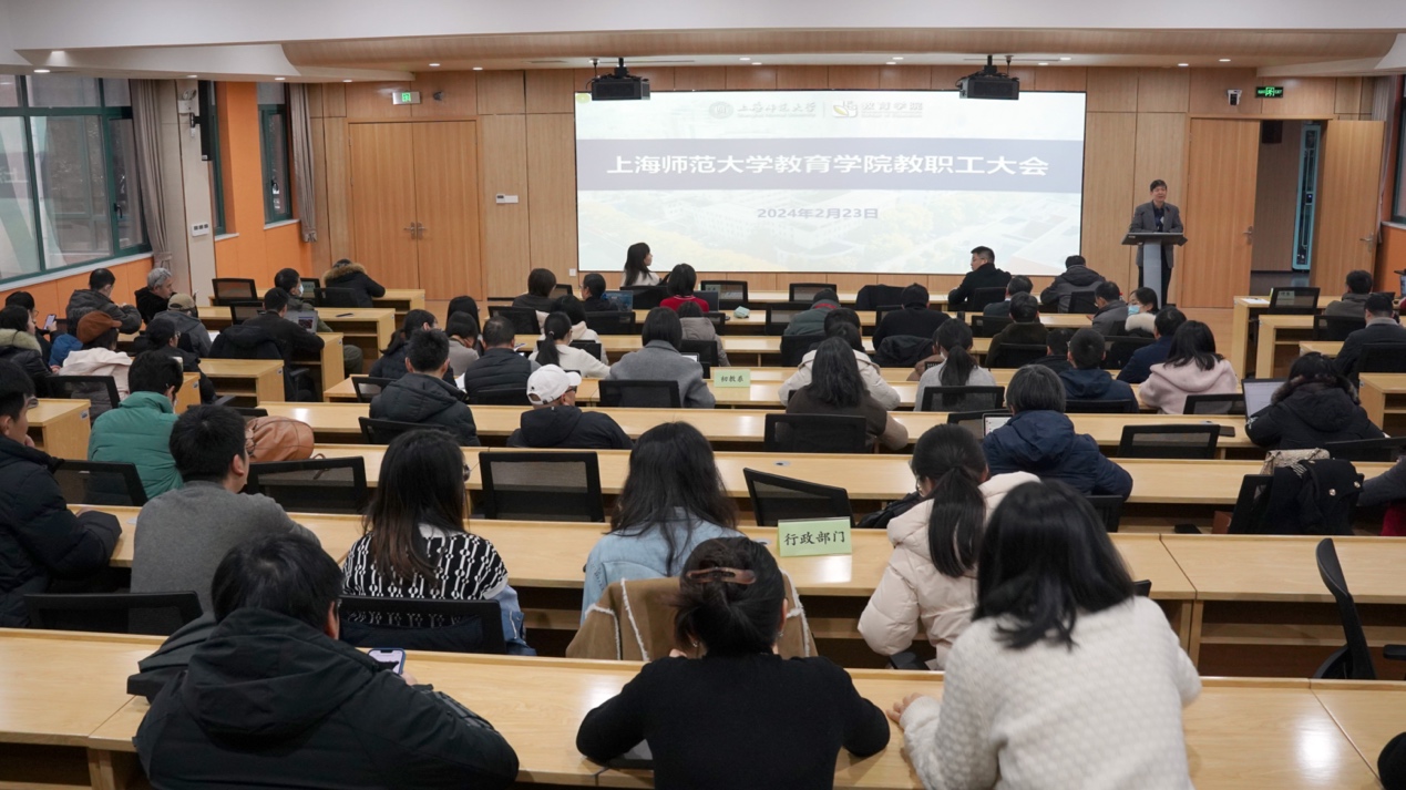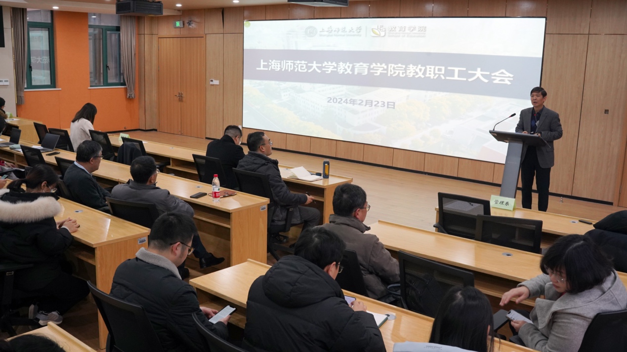 黄海涛院长围绕学科建设以及人才和师资队伍建设两个方面阐述了未来几年学院发展的总体目标和发展举措。在学科建设方面,黄海涛院长提出,通过3-5年时间努力使教育学内涵发展取得显著成效,达到一流学科水平,基本形成高水平教师教育学科体系,努力成为中国教师教育改革的先锋队和上海基础教育发展的总引擎。在人才和师资队伍建设方面,坚持“师德为先、育人为本、科研为基、服务为要”原则,紧紧围绕一流学科建设需要,坚持引育并举,努力打造一支师徳高尚、学术精湛、结构优化、富有创新意识和国际视野的高素养、专业化教师队伍。徐晓明书记对学院教职工过去一年的突出贡献给予了肯定,并着重从党建保障、制度保障、管理保障三方面强调了2024年的工作重点。