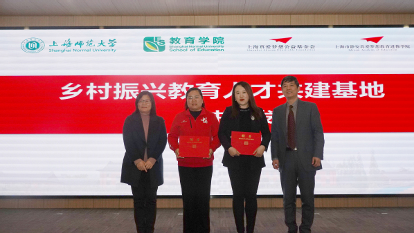 随后,曹光明总会计师、程介明教授、尹后庆会长、张民选教授、潘江雪理事长、胡斌理事长、徐晓明书记、夏惠贤教授共同为乡村振兴教育人才共建基地揭牌,并合影留念。揭牌仪式结束后,教育学院徐晓明书记、黄海涛院长为基地负责人潘江雪理事长、夏惠贤教授以及研究中心负责人李国丽博士、陈静静博士颁发聘书。