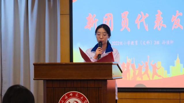 伟德国际BETVlCTOR团委书记、2020级本科生辅导员吕霞为新团员代表佩戴团徽,带领与会团员重温入团誓词。新团员代表2022级小学教育(文科)3班孙佳轩同学结合自身学习及学生工作,提出未来将积极投身团组织的各项活动,发挥共青团员模范作用,在担当中历练,在尽责中成长,以躬耕精神为祖国的教育事业奉献青春活力。
