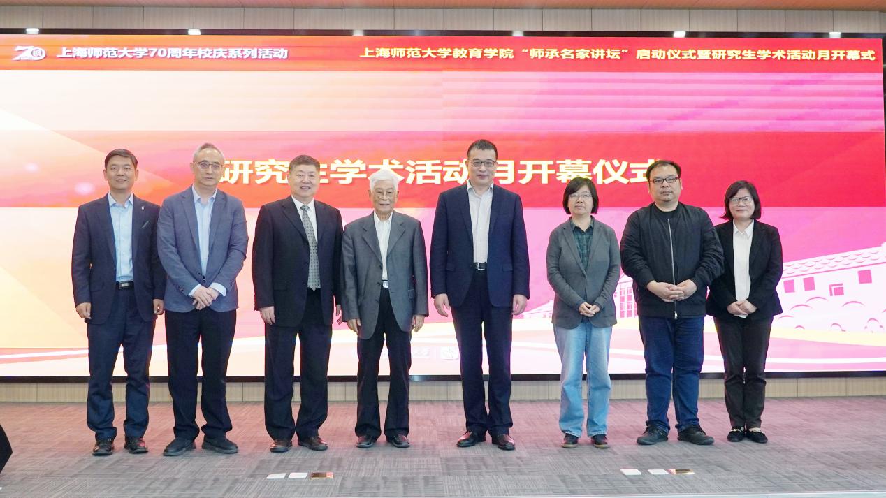 顾明远先生和陈恒副校长共同为“师承名家讲坛”揭幕。顾明远先生、陈恒副校长、张民选主任、董丽敏常务副院长、范国睿部长、姚潇鸫处长、徐晓明书记、黄海涛院长共同为“研究生学术活动月”揭幕。教育学院副院长魏峰介绍了学术活动月实施方案。