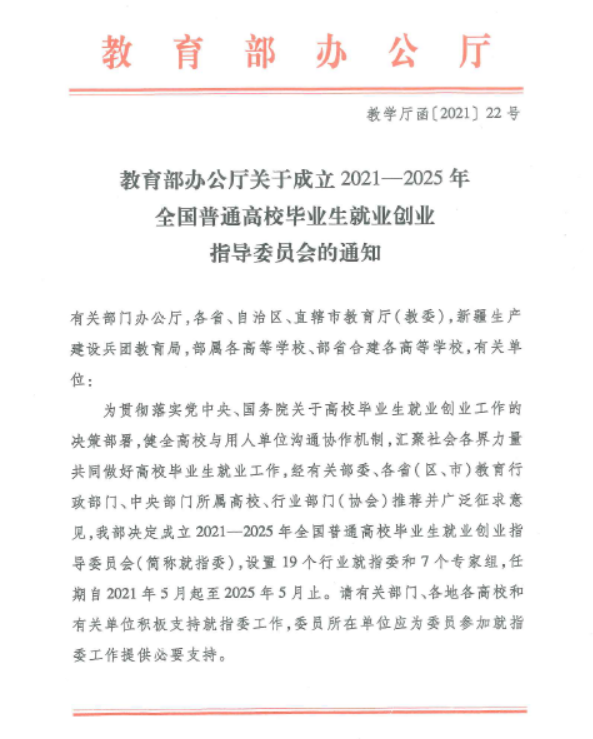 为推动大学生就业创业,健全高校与用人单位沟通协作机制,汇聚社会各界力量共同做好高校毕业生就业工作,教育部于5月13日成立了2021-2025年全国普通高校毕业生就业创业指导委员会,下设19个行业就指委和7个专家组。我院范为桥教授受聘担任就业评价与统计专家组和医药卫生行业就业创业指导专家组成员(2021-2025)。