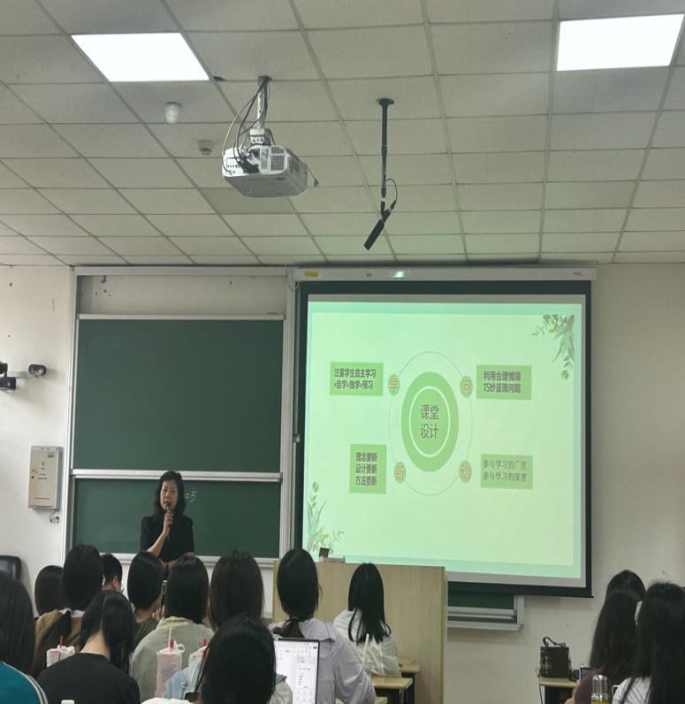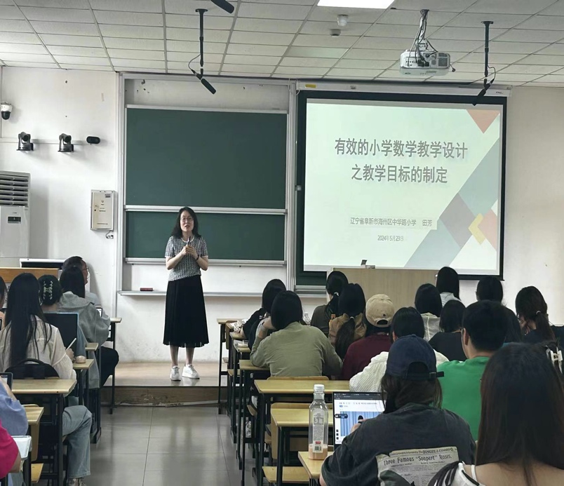 5月23日,刘志乐、田芳、王仁正和崔淑婷四位中小学正高级教师走进大学课堂,分别就“教学设计重要环节”、“有效的小学数学教学设计之教学目标的制定”、“基于数学文化背景下的数学课堂教学设计”、“精品课的设计”等主题和师范生进行了分享。四位名师的分享主题围绕着数学课堂教学设计展开,又各有侧重点,与《小学数学课程与教学》的课程内容高度契合,较好地体现了理论知识与实践案例的有效结合、整体与部分的密切关联。