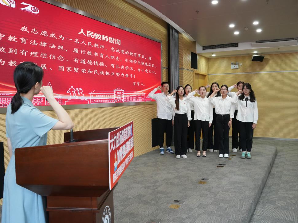 铮铮誓言映初心,字字铿锵担使命。在杨伊老师的带领下,在场学生高举右拳,庄严宣誓,立志以优秀教师为榜样,忠诚党的教育事业,履行教书育人使命,成长为有理想信念、有道德情操、有扎实学识、有仁爱之心的“四有”好老师。