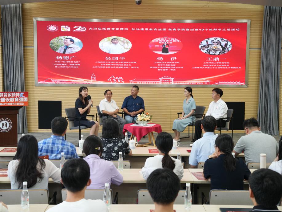 活动特别邀请到中国“当代教育名家”、原上海师范大学校长杨德广教授,“人民教育家”于漪教育思想研究专家、伟德国际BETVlCTOR吴国平老师,全国高校青年教师教学大奖赛一等奖获得者杨伊老师以及上海师范大学第25届研究生支教团成员王鼎一同学共同参与“老中青三代”共话教育家精神主题沙龙,他们结合自身的教育教学和研究经历,从理解、弘扬、践行教育家精神三个层面分享自己的教育故事和教育感悟。