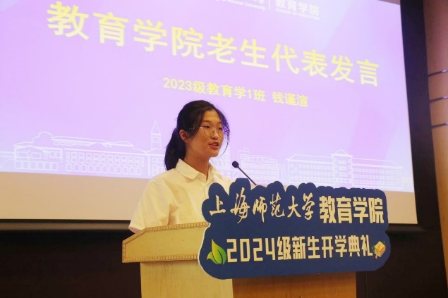 来自2023级教育学1班的钱谨渲同学作为老生代表,分享了自己大学生活的亲身经历,鼓励同学们多去尝试、勇于挑战,合理规划大学生活,积极参与团队合作,重视个人成长,践行师范生的使命与担当。2024级小学教育(理科)2班的向凌霄同学作为新生代表,结合自己的实际经历讲述了对教育的感悟和憧憬,并呼吁全体新生培养扎实学识,始终保持昂扬进取的姿态和永不懈怠的精神,为青春筑梦,为时代育人。