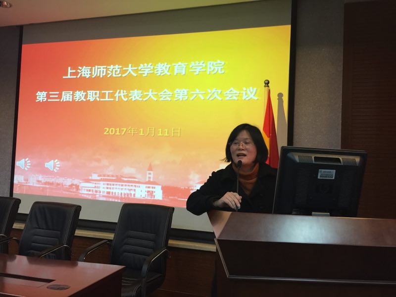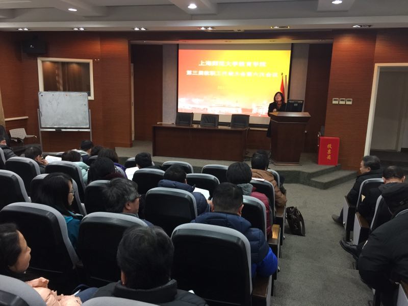 年1月11日上午在徐汇校区第四教学楼B101室,教育学院召开了第三届教职工代表大会第六次会议,代表们认真听取了夏惠贤院长所作的《教育学院2016年度行政工作报告》以及《