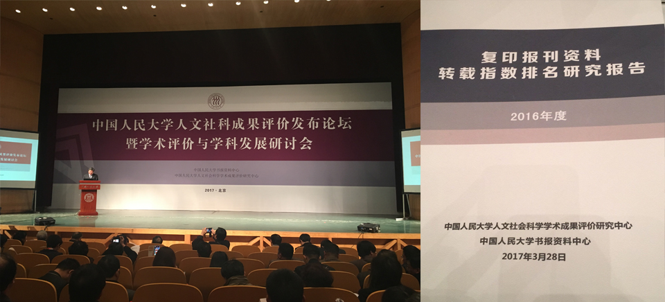 3月28日,中国人民大学人文社科成果评价发布论坛暨学术评价与学科发展研讨会在人民大学如论讲堂举行。本次会议由中国人民大学主办,人文社会科学学术成果评价研究中心和书报资料中心承办。来自中宣部、教育部、国家新闻出版广电总局等中央党政部门领导,国内各科研机构、高等院校、党校及行政学院系统负责人,人文社科知名学者以及学术评价研究界和学术期刊出版界的专家学者出席了本次会议。