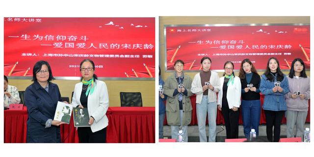 除了精彩的讲座外,苏敏老师代表上海市孙中山宋庆龄文物管理委员会向上海师范大学赠送系列主题图书和相关文创产品,引起不少同学的兴趣。
