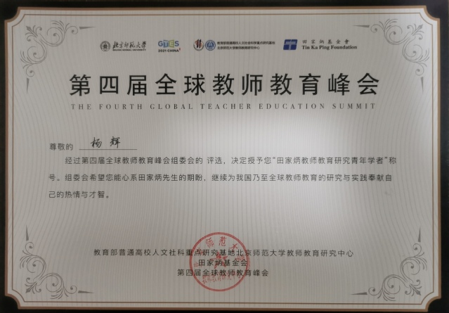 该论坛由北京师范大学教师教育研究中心发起主办,得到田家炳基金会全力支持,迄今已经举办四届。本届论坛参会人数创历史新高,数以万计学者、教师、高校学生以线上线下参加会议,共同关注研讨全球范围内教师教育的政策、研究与实践主题。获受资助的田家炳教师教育研究青年学者和国内外教师教育研究专家就科技、国际、政策视野下的教师与教师教育等领域核心问题,进行了为期一天的探讨,并遴选出 50 名优秀“田家炳教师教育研究青年学者”,杨辉为其中之一。
