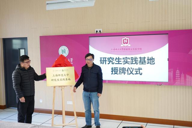 在正式会议上,教育管理系教授陈韶峰与上师五实验校长陈勇在党员教师代表的见证下共同为上海师范大学研究生实践基地隆重授牌。