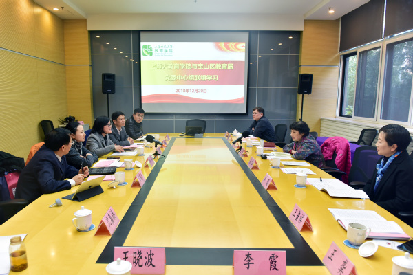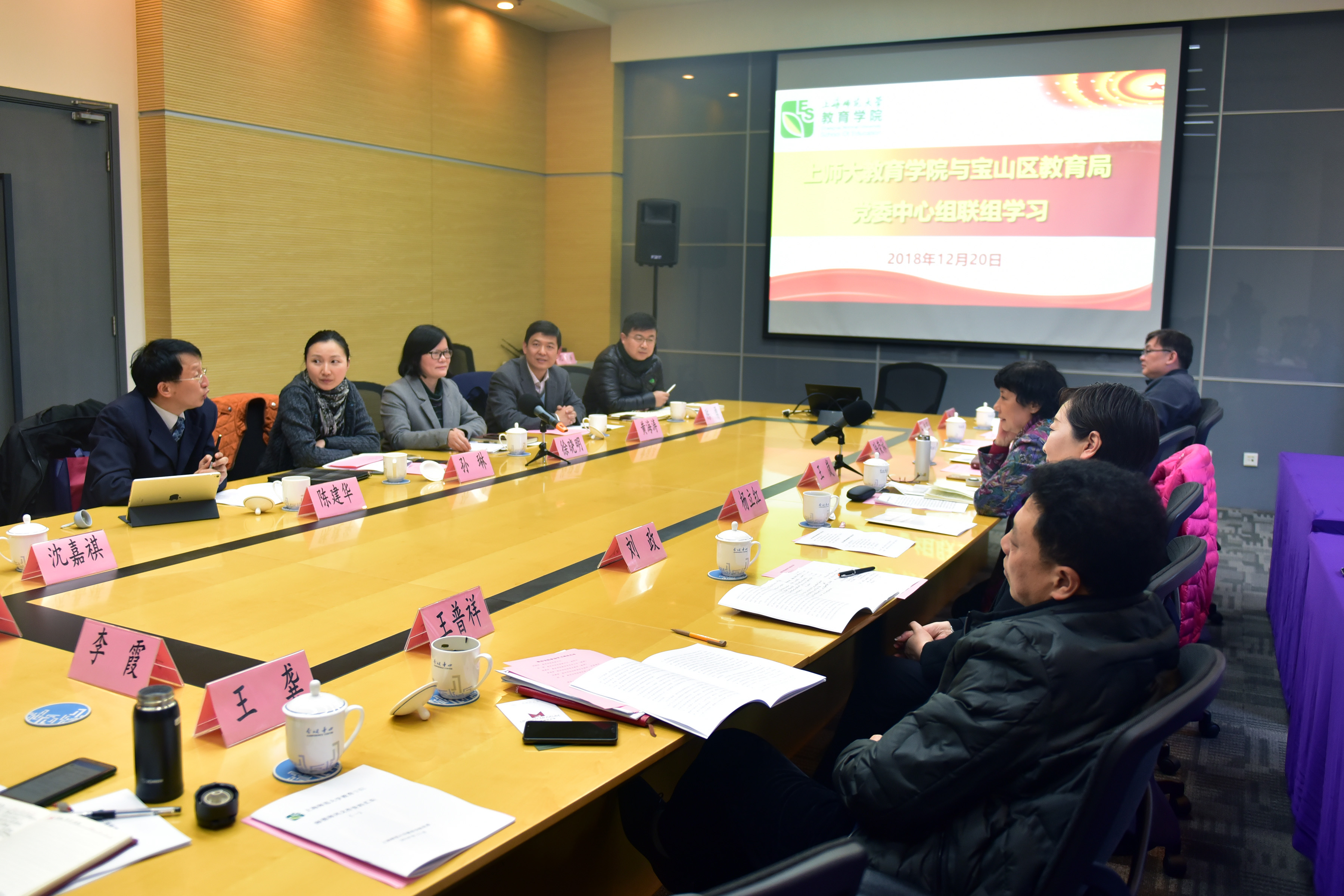12月20日下午,教育学院党委与宝山区教育局党委在会议中心5号会议室开展了中心组联组学习。宝山区教育局党委书记王岚,党委副书记、局长杨立红,全体党委中心组成员,党支部书记代表以及教育学院党委书记徐晓明,党委副书记、副院长孙琳,部分党委中心组成员,支部书记代表,教授代表出席了本次学习。在联组学习开始前,学校统战部安排了宝山区教育局的同志们参观了上师大博物馆、校史馆等,教育局的同志们在参观中对师大深厚的学术底蕴和为上海教师教育所做出的贡献给予了高度的评价,并对后续的深入合作有了更殷切的期待。学习会由教育学院党委书记徐晓明主持。