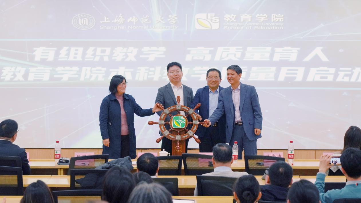 随后,戴勇副主任、王健处长、徐晓明书记、黄海涛院长一同上台,共同拨动象征着“教育”这艘大船的船舵,标志着教育学院首届本科教学质量月的正式启动,也预示着教育学院在教育改革和发展的新征程上乘风破浪,勇往直前。
