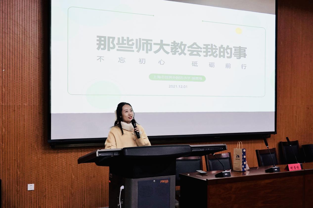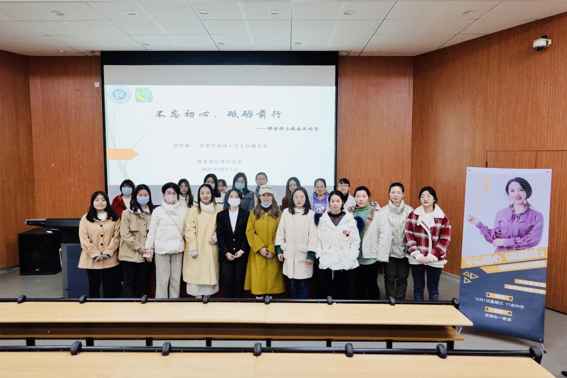 为了积极响应高校思想政治工作会议精神,不断推进思想政教育创新发展,促进全体学生学习和践行习近平新时代中国特色社会主义思想。2021年12月1日,教育学院研究生会在东一教室举办“不忘初心,砥砺前行”主题朋辈活动。本次活动有幸邀请到了徐汇区世界外国语小学的大队辅导员胡雪缘老师。胡雪缘老师毕业于上海师范大学,是教育学院2006级小学教育本科以及2009级课程与教学论专业的硕士。心系教育,反哺母校,惠及桑梓,胡雪缘老师用生动的演讲为同学们进行了一次思政教育。