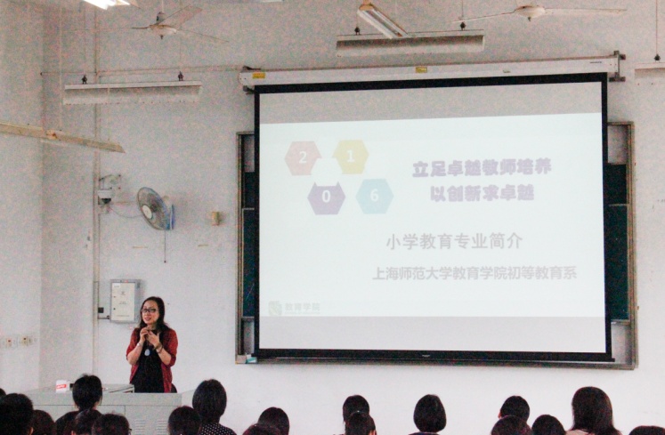 钟文芳老师以“立足卓越教师培养,以创新求卓越”为主题向同学们详细介绍了小学教育专业在师资配备、课程设置、活动竞赛和见习实习等诸多方面为同学们提供的多种提高自身专业素养和实践能力的平台,并期望同学们能成长为具有专业的教师素养、坚定的情意、广博的知识和远大志向的卓越教师。同时,钟老师和新生们分享了小教专业良好的就业前景,鼓励新生及早确立发展目标,积极寻求各种帮助,不断充实自我、完善自我。