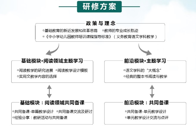 学科骨干教师有二次专业成长的需求。在当前基础教育改革的新挑战中,这一需求表现为:亟需提升能够应对并引领本地区语文教育教学改革的能力。为此,本次研修确定的主题为“学科核心素养”指向的语文阅读教学能力和课程改革能力的提升;设置了三个模块——政策与理念、基础模块(阅读领域)和前沿模块。