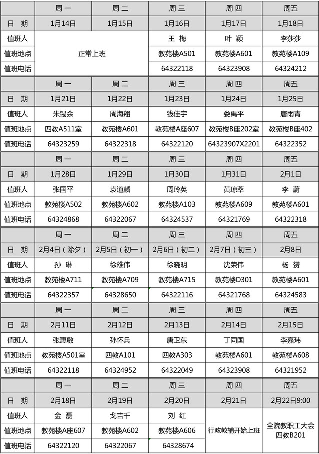 2019年教育学院寒假值班表(徐汇)