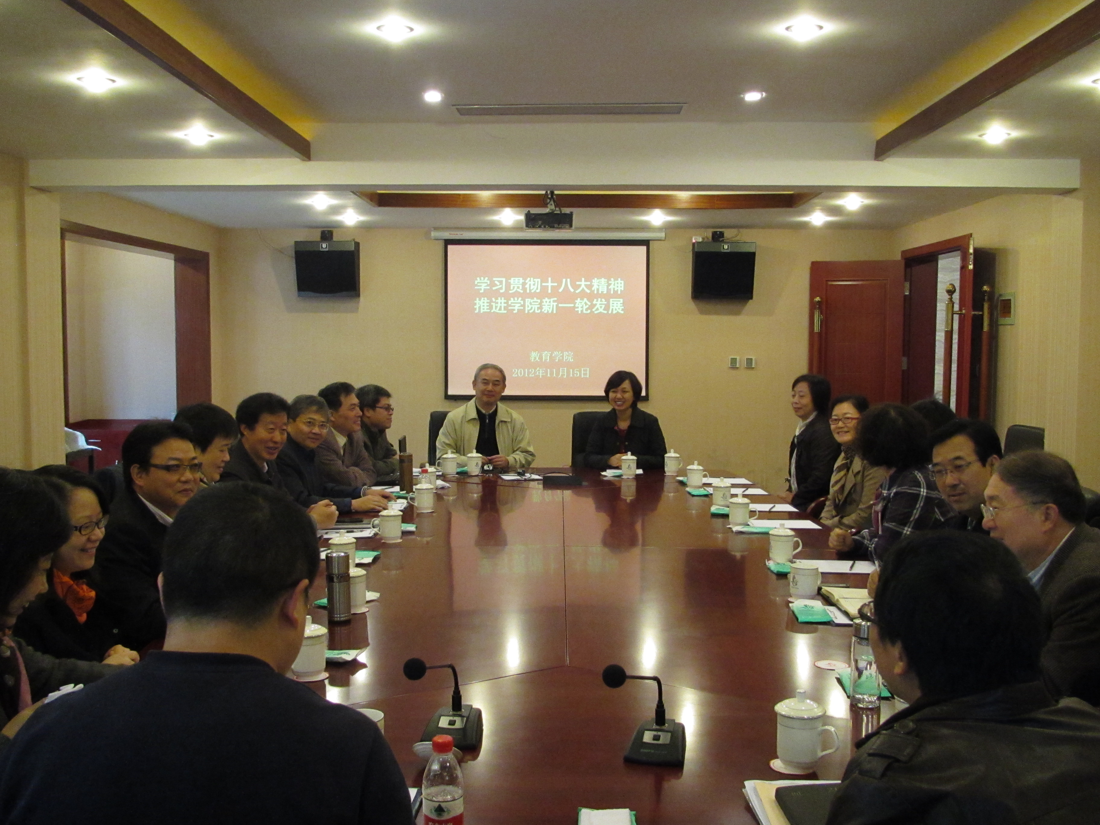 11月14日下午至15日上午,教育学院召开为期两个半天的中层骨干会议,以“学习贯彻十八大精神,推进学院新一轮发展”为主题,结合学院党员大会筹备工作,就学院过去工作总结及未来新一轮发展进行了深入研讨。