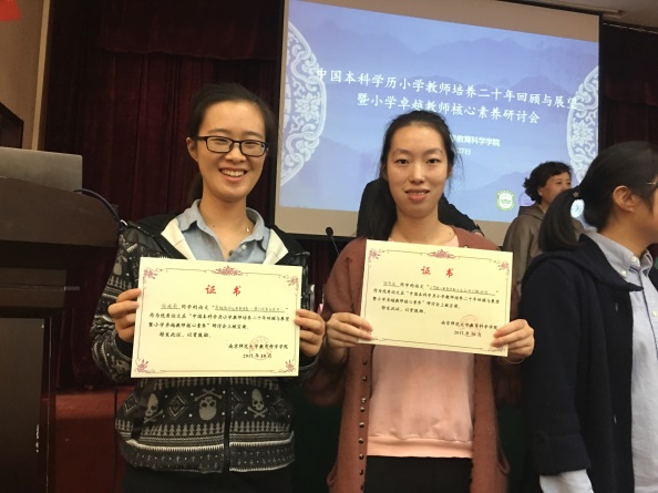 此次研讨会的创新之举在于设立本科生研究论坛,为此,小学教育专业的师生在研讨会之前做了认真准备,在钟文芳和吴艳老师的指导下,两位2014级世承班学生陈晓莉和徐宇岚反复修改论文和发言PPT。会上,来自四所高校的本科生代表就自己的论文与研究成果在大会上进行了展示,四所高校的与会专家们分别从选题、研究方法、主要观点等方面对学生的研究进行了详细点评和分析,既给予积极的肯定和鼓励,也提出了继续研究的方向。我院初等教育系小学教育专业的2014级世承班陈晓莉和徐宇岚两位同学分别以“卓越教师的职前准备——基于调查的思考”和“小学新入职教师职业适应性问题研究”为题进行汇报,得到在座专家的一致好评。