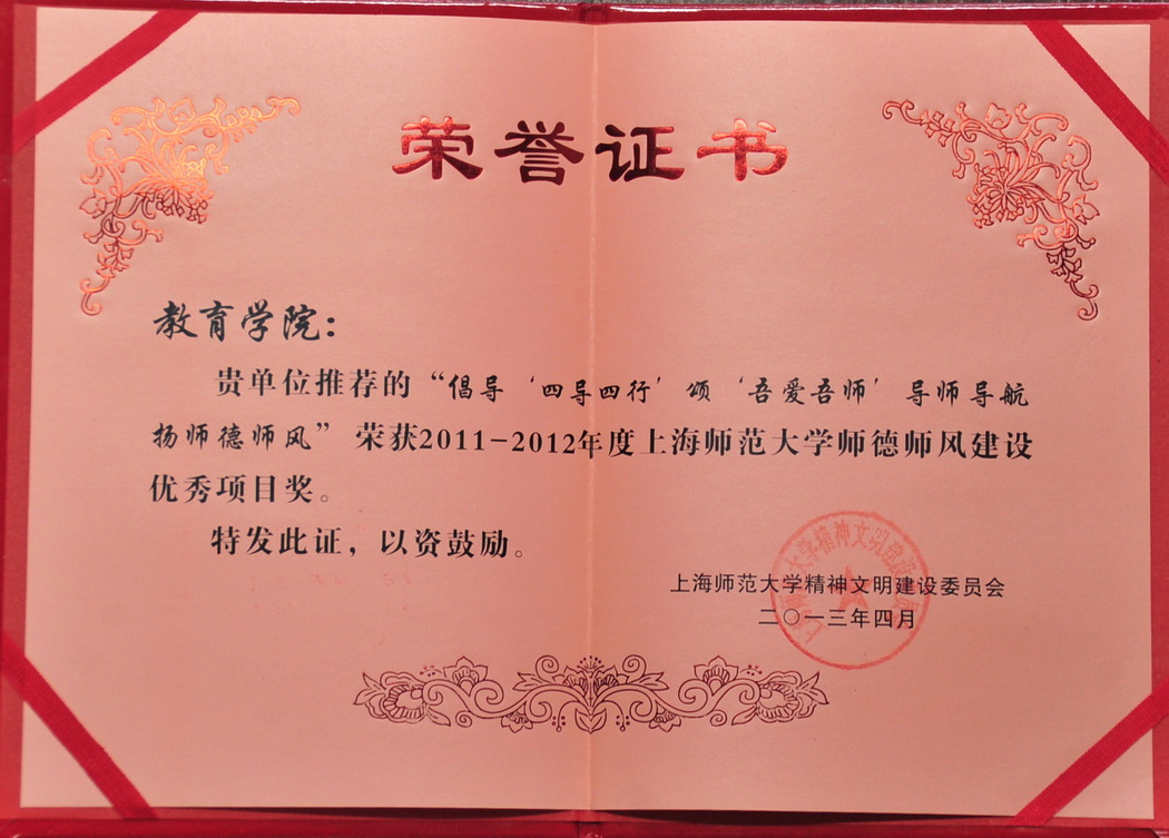 日前,在上海师范大学精神文明建设委员会的评比工作中,教育学院推荐的“倡导‘四导四行’颂‘吾爱吾师’导师导航扬师德师风”荣获2011-2012年度上海师范大学师德师风建设优秀项目奖。