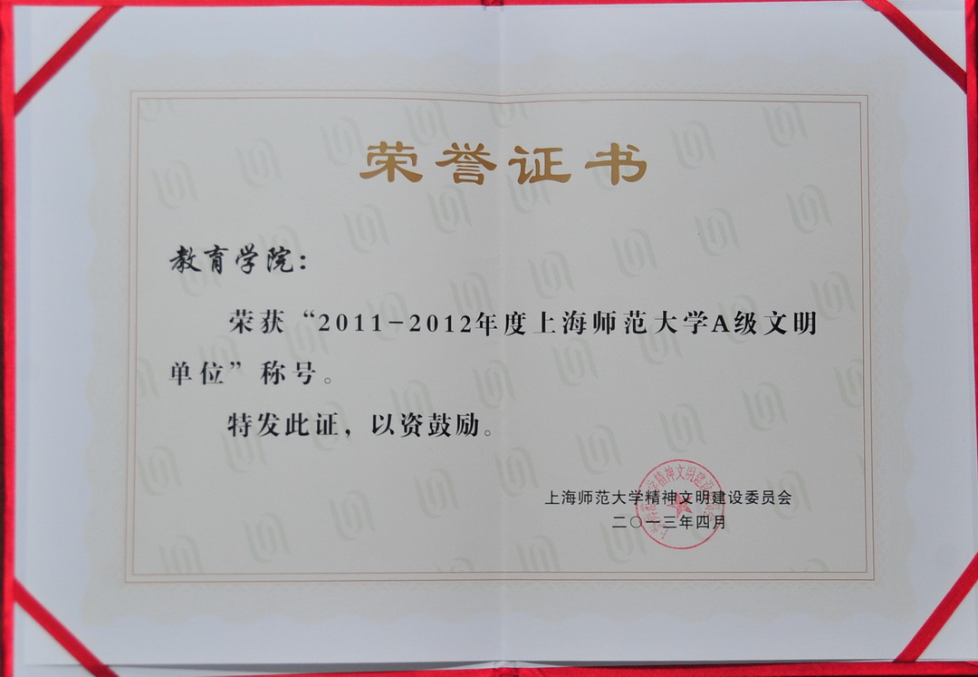 日前,在校精神文明委员会开展的2011-2012年度基层文明创建工作检查评比活动中,教育学院荣获“A级文明单位”。