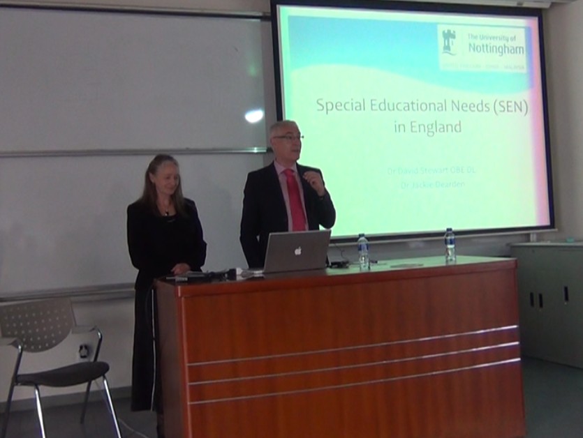 2013年11月22日上午10:30四教201教室,在何慧华副教授的主持下,英国诺丁汉大学的David Steward博士和Jackie Dearden博士,为教育学院师生带来了一场题为“英国特殊儿童的教育需求”的讲座。