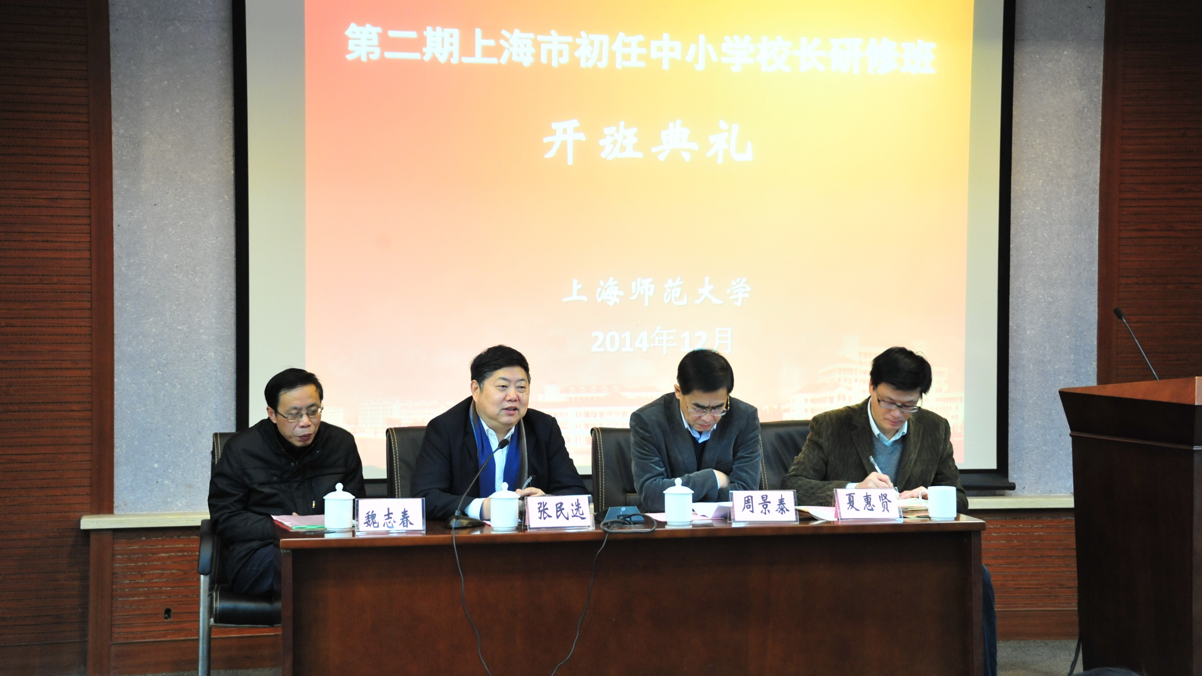 2014年12月26日上午9点,第二期上海市初任中小学校长研修班开班典礼在上海师大第四教学楼101会议室隆重举行,典礼由教育学院院长夏惠贤教授主持。出席典礼的领导有上海师大国际与比较教育研究院院长、原上海师大校长张民选教授,上海市教委人事处周景泰处长,教育学院副院长胡国勇教授。本期校长研修班导师华东师大魏志春教授、上海师大陈建华教授、冯震研究员、陈韶峰教授,以及上海市建青实验学校戴群校长、上海市康城学校唐正权校长、闵行区蔷薇小学沈珺校长、宝山区长江路小学袁菲校长均参加了开班典礼。出席典礼的还有本期研修班的各位校长以及各组研究生秘书。