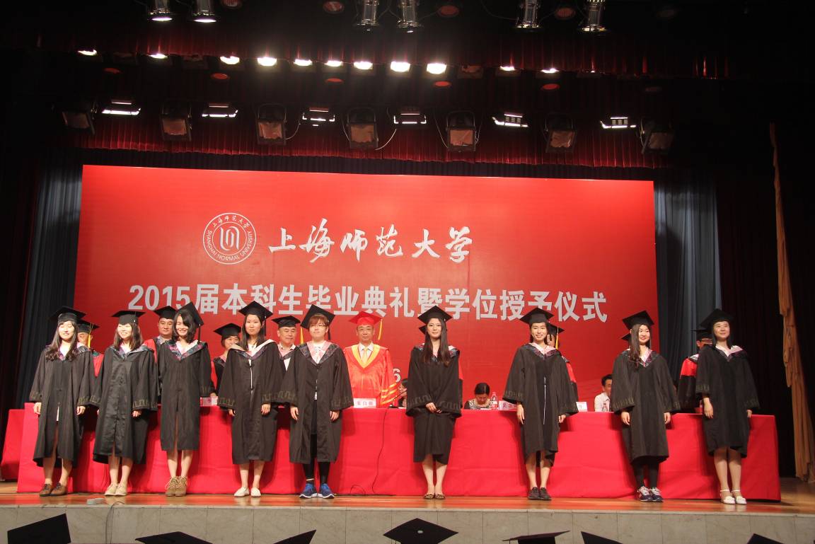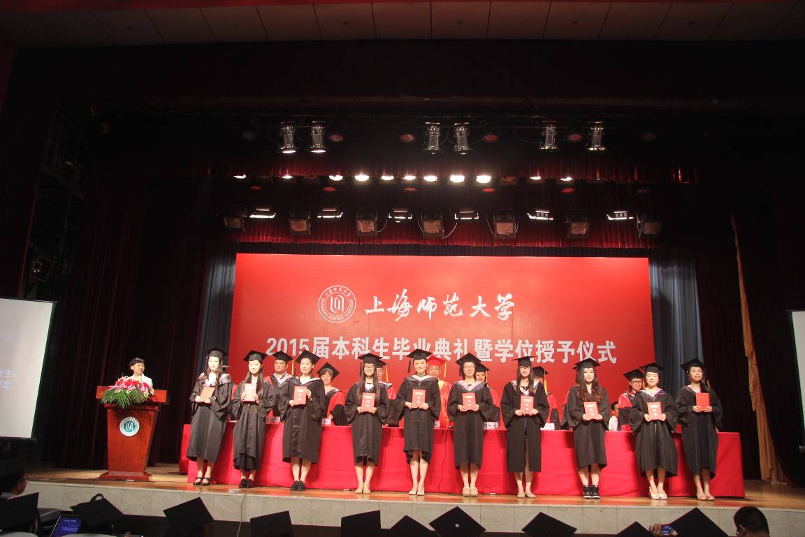 雄壮的国歌声后,教育学院党委书记周银娥老师为全体毕业生致辞,周老师将亲切的祝福、殷切的希望送给毕业生们,希望大家在崭新的人生旅程中,胸怀梦想、肩负使命、勇于践行。随后进行了2015年上海市高等学校优秀毕业生和上海师范大学优秀毕业生的表彰。在教师代表和学生代表发言之后,是庄重的学士学位授予仪式。之后,毕业生们庄严宣誓,毕业后将以才智服务社会,在未来的岗位上奉献青春!最后,全体毕业生以深深地一鞠躬表达了对家长及教师们的感恩之情,与同学彼此拥抱,互相感谢、祝福。