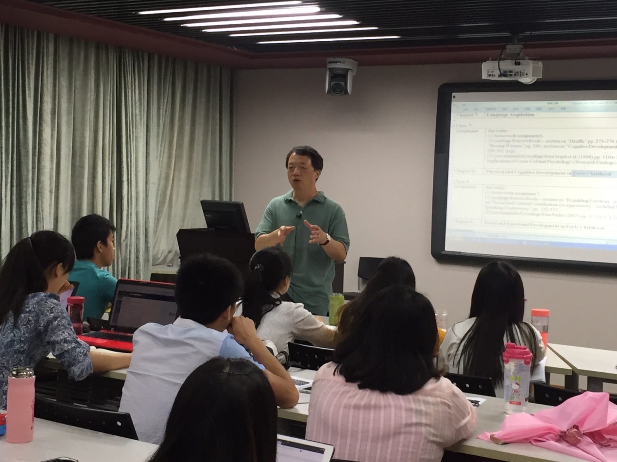 薛烨教授多年来一直关注文化与儿童发展的研究,他的著作《三种文化中的幼儿园》以及《重访:三种文化中的幼儿园》在国际学前教育领域引起了广泛关注。他的课程聚焦文化与儿童发展的互动,文化对幼儿教育的影响。他的课程内容丰富有趣,形式多样。该课程将指定部分阅读材料,要求学生积极参与讨论、完成阅读任务及其它课后作业,课程结束时进行小组报告。参加本课程学习的学生包括学前教育专业世承班学生和研究生共计30余人,课程将持续一周。开课仅一天,薛烨教授就以其严谨的治学态度、深厚的学识积淀、风趣的授课风格迅速征服了学生,使得学生初步感受到美式课堂的魅力。开课期间,学前教育系与薛烨教授就以后的可能合作进行了多次洽谈,确定了初步的合作计划。