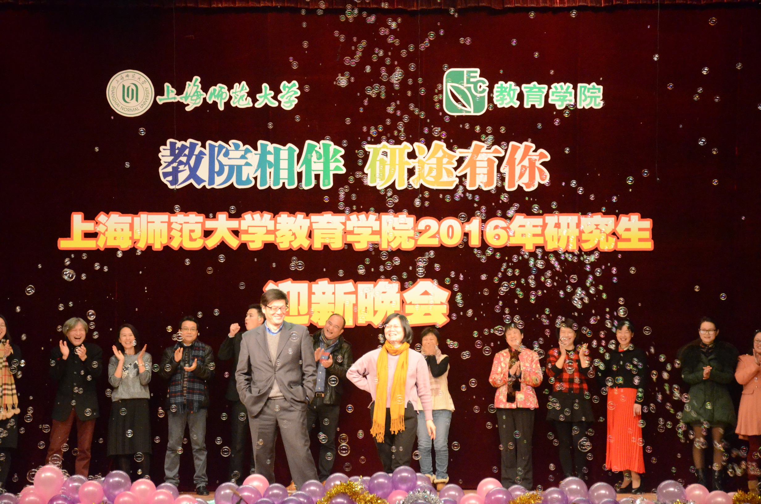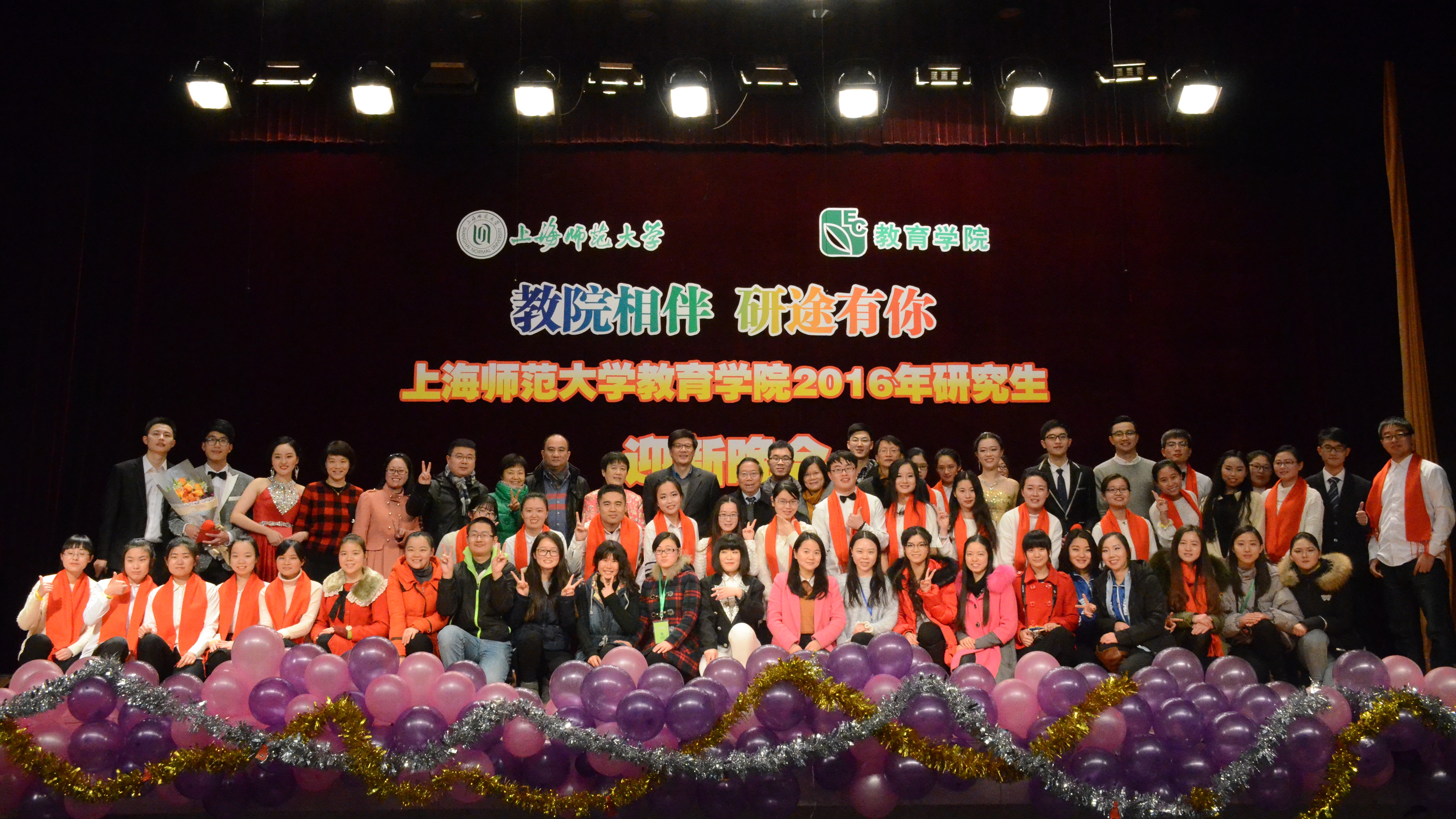 2015年12月28日晚6点,由教育学院研究生会主办的“教院相伴研途有你” 2016伟德国际BETVlCTOR研究生迎新晚会在上海师范大学东部礼堂隆重举行。晚会很荣幸邀请了上海师范大学前校长杨德广教授,教育学院的党委书记徐晓明老师,院长夏惠贤老师,副书记、副院长谢青老师,副院长胡国勇老师,副院长徐雄伟老师以及学院各科系各专业、各部门负责人及导师、辅导员共计20多位老师出席本次晚会。师生欢聚一堂,其乐融融。