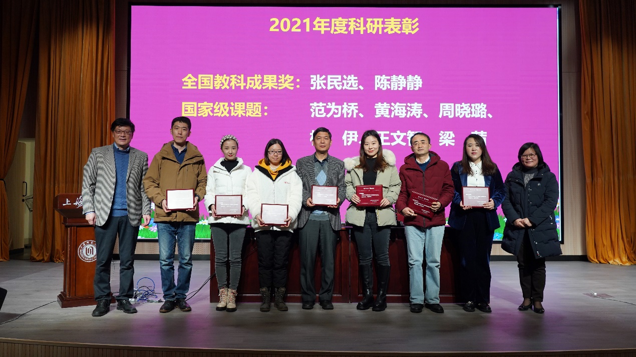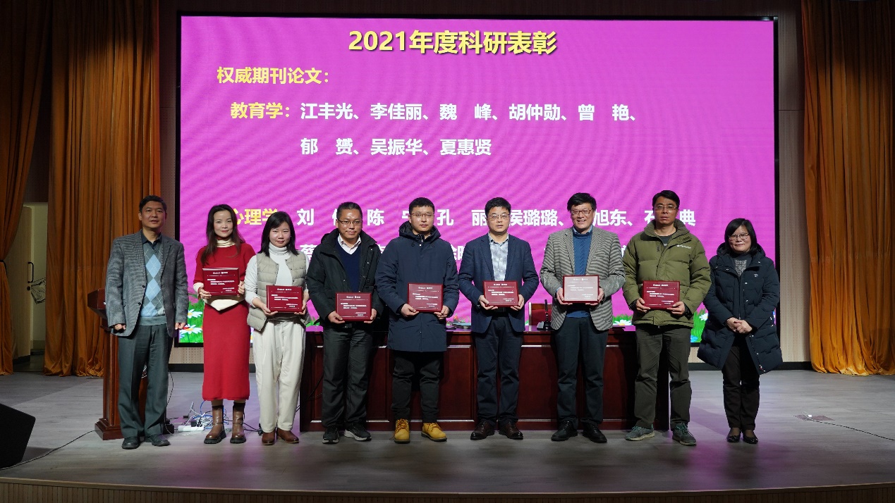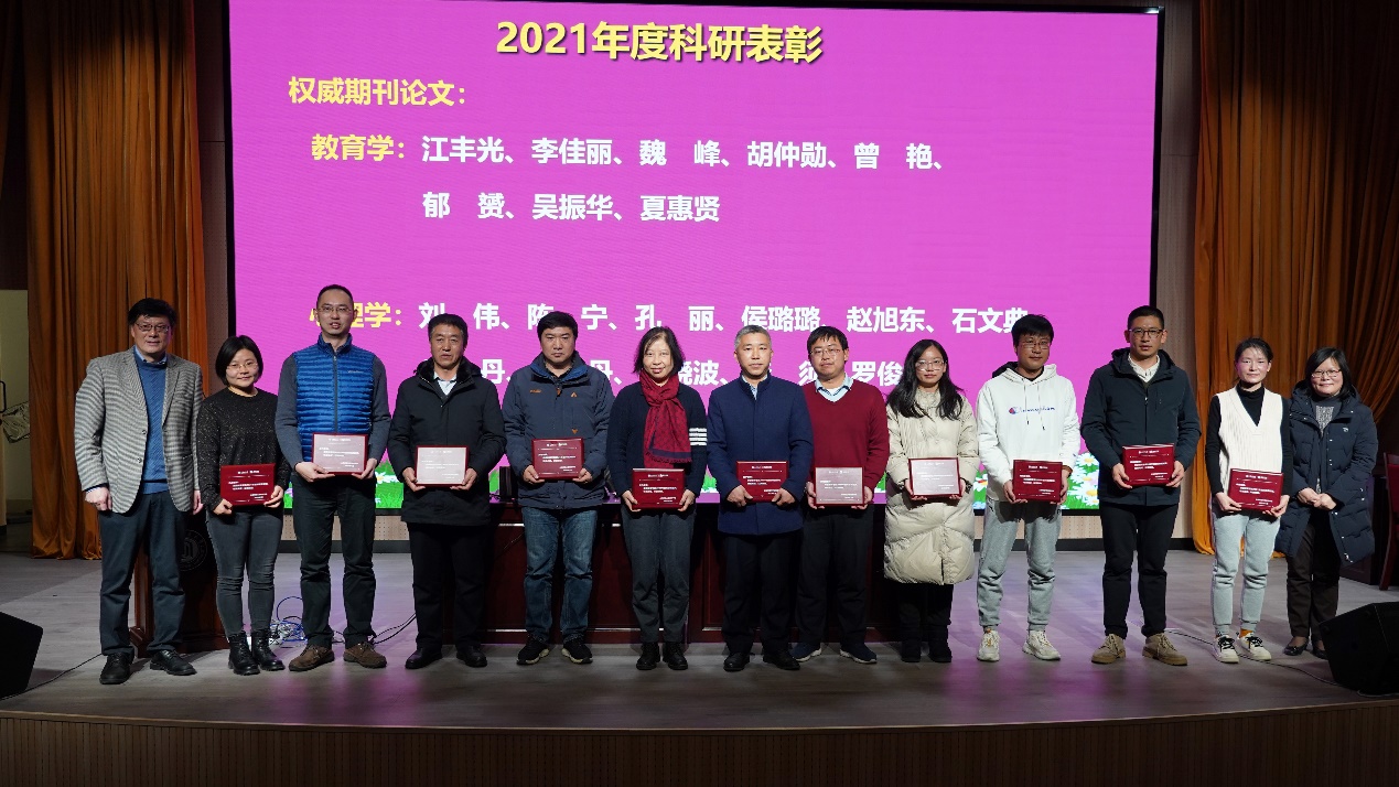 学院对获得国家级奖励和科研项目的教师张民选、陈静静、范为桥、黄海涛、周晓璐、杨伊、王文智、梁茜等进行了表彰。对教育学和心理学科研工作突出的教师夏惠贤、江丰光、李佳丽、魏峰、胡仲勋、曾艳、郁赟、吴振华、石文典、刘伟、陈宁、孔丽、侯璐璐、赵旭东、蔡丹、李丹、徐晓波、李须、罗俊龙等进行了表彰。徐晓明书记,夏惠贤院长,黄海涛副院长分别给获表彰的老师颁发奖牌。