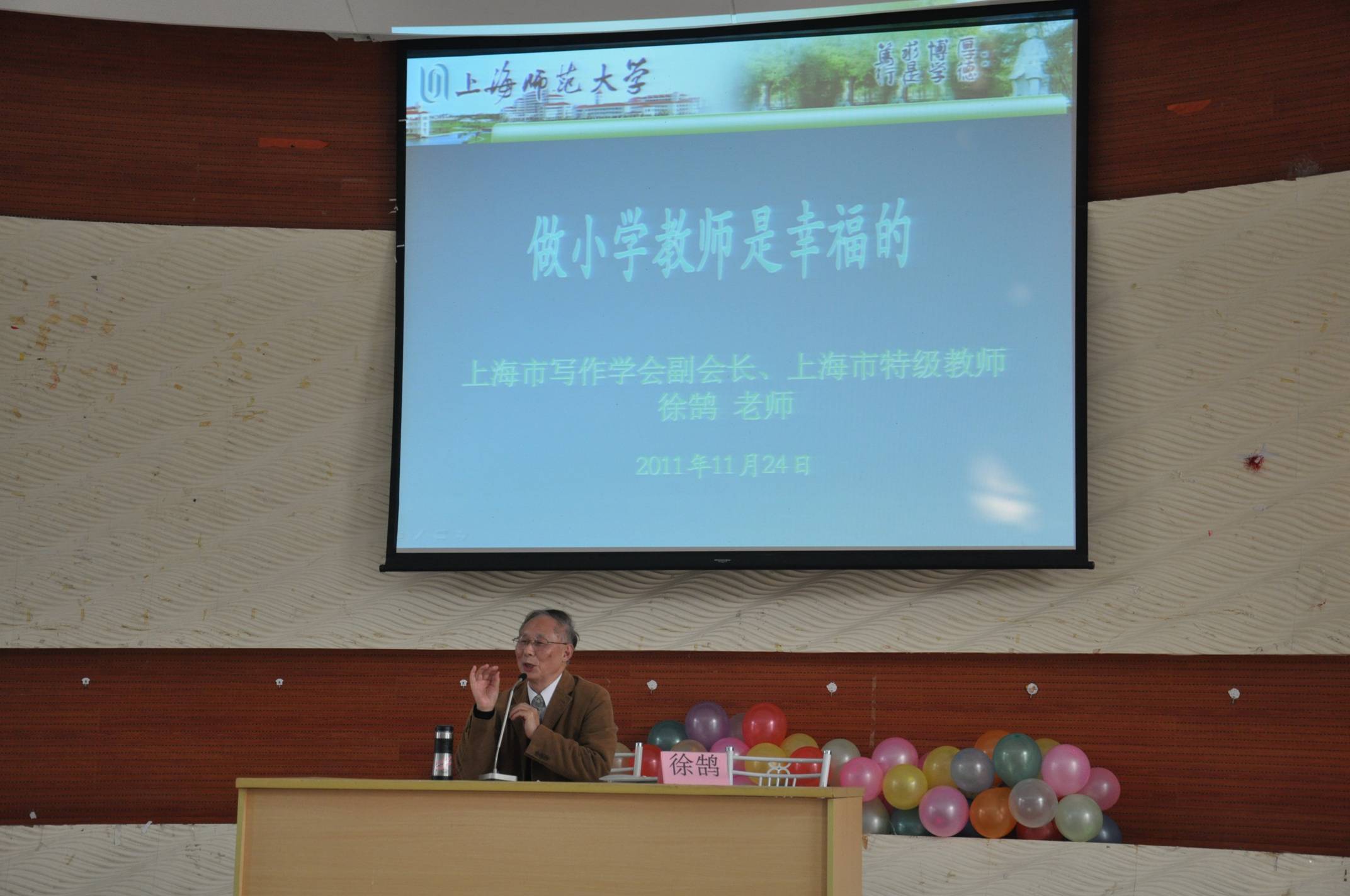 2011年11月23日下午,在上海师范大学奉贤校区大学生活动中心101,邀请到了上海市写作学会副会长、上海市特级教师徐鹄老师给10级、11级小学教育同学带来了《做小学教师是幸福》的讲座。
