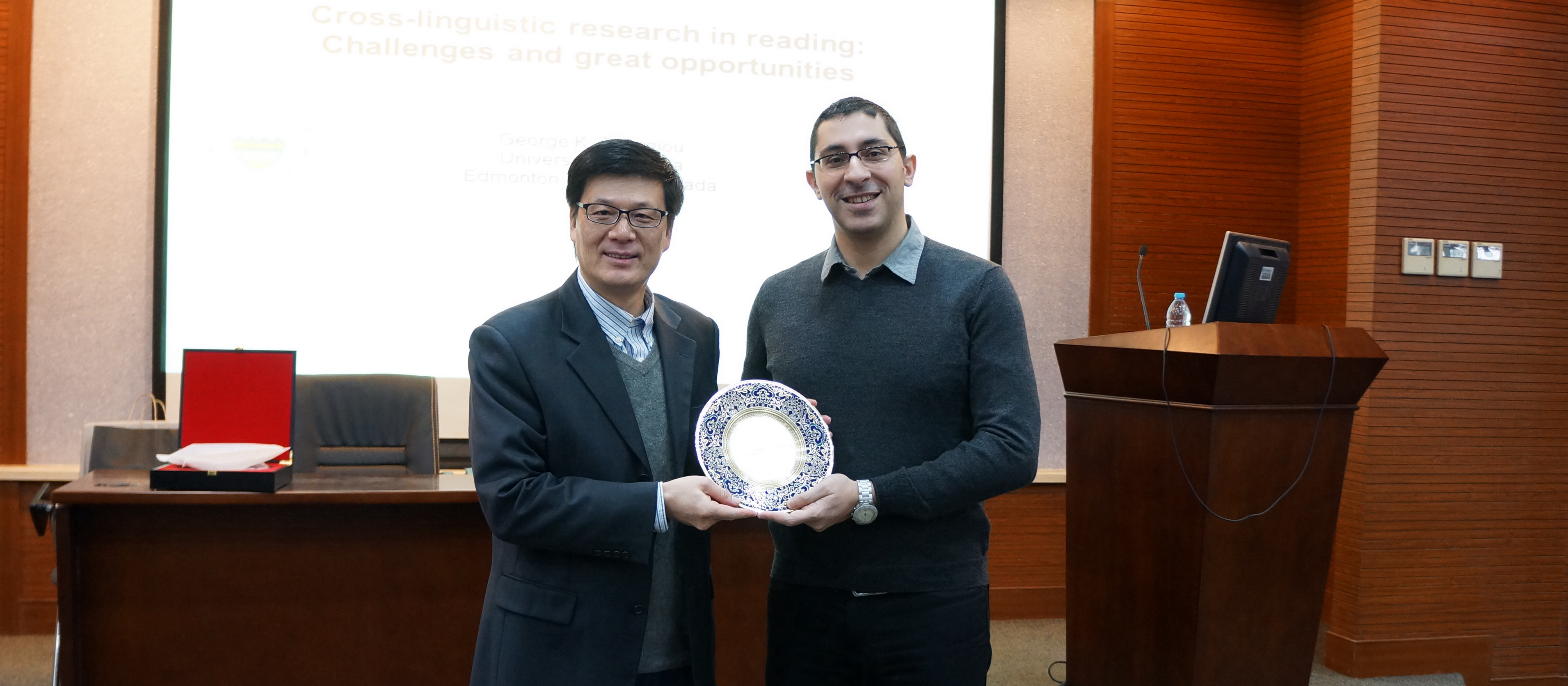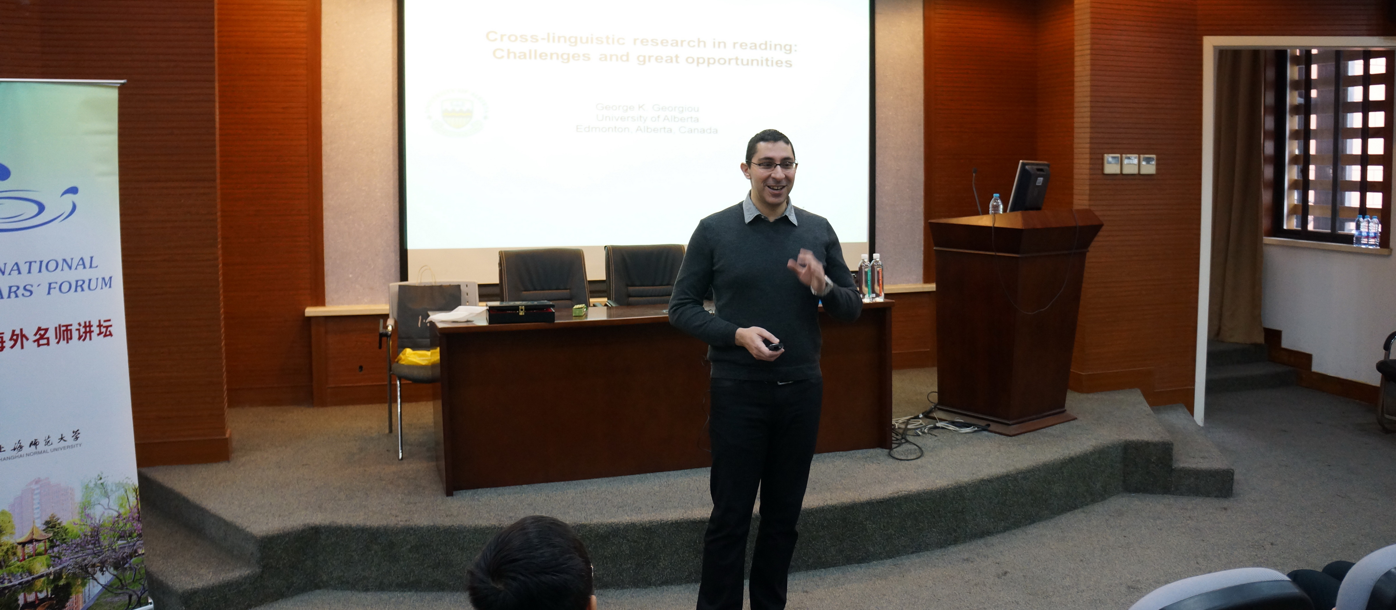 2016年12月19日,加拿大阿尔伯特大学(University of Alberta)教育学院教育心理系教授George K. Georgiou博士莅临我院,作客上师大学思湖海外名师讲坛,并在第四教学楼作了题为“阅读中的跨语言研究:机遇与挑战(Cross-linguistic research in reading: Challenges and great opportunities)”的报告。Georgiou教授长期从事儿童阅读和语言发展的研究,在塞浦路斯教育和文化部担任研究员。学院夏恵贤院长,心理系刘俊升教授,蔡丹副教授,教育管理系周晓璐博士,学前教育系魏威博士等教师出席讲坛。夏院长在讲坛开幕仪式上,为Georgiou教授颁发了上海师范大学的纪念铜牌。