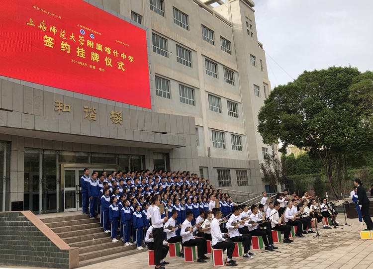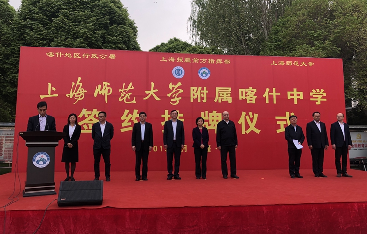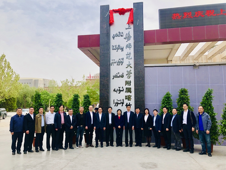 4月14日上午,滕建勇代表学校与新疆喀什地区行政公署、上海援疆前方指挥部共同签署了“联合建设上海师范大学附属喀什中学的协议”。上海市教卫工作党委书记虞丽娟、我校党委书记滕建勇、副校长张峥嵘、上海援疆前方指挥部总指挥史家明、喀什地区行署专员帕尔哈提•肉孜共同为上海师范大学附属喀什中学揭牌。本次挂牌的上海师范大学附属喀什中学是一所具有60多年办学历史的寄宿制高中,在喀什当地称为喀什第六中学。2018年学校成为喀什地区国语教育全覆盖的第一所高中学校。该校现有学生2800多人,教师300多人,民族学生数占到学生总数的95%以上。在上海市援疆前方指挥部的高位推动下,我校将基础教育的优质资源辐射喀什的愿望得以实现,我校将更好地利用基础教育集团学校的优势,在大组团式援疆总体思路的指导下,向喀什地区输出优质的教育资源和学校管理理念,携手第一所外省市高校在喀什地区附属的中学,共同谱写教育援疆的新篇章。