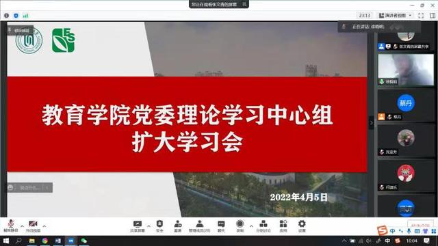 4月5日上午,教育学院党委以中心组扩大会议的形式,认真组织学习习近平总书记在3月17日中共中央政治局常务委员会会议上关于疫情防控的重要指示精神和孙春兰副总理在上海调研疫情防控中提出的工作要求。同时就学院疫情防控工作进行专题部署。学院党委中心组全体成员和党支部书记在线参加会议。会议由院党委书记徐晓明主持。