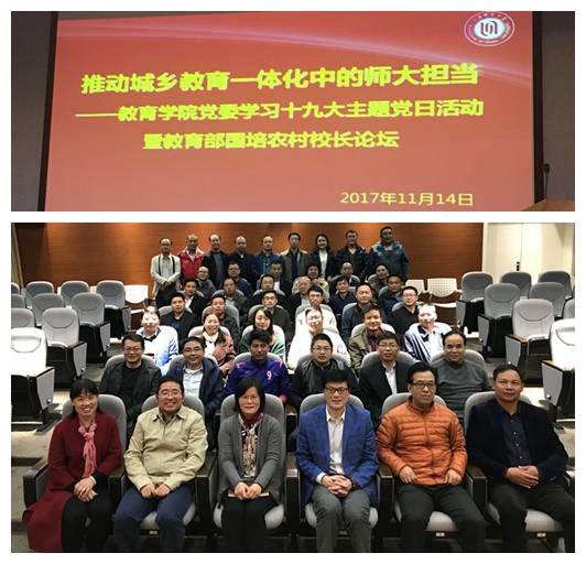 11月14日晚,作为教育学院党委学习宣传贯彻党的十九大精神系列活动之一,“推动城乡教育一体化中的师大担当”——教育学院党委学习十九大主题党日活动暨教育部国培农村校长论坛在东部四教B101举行。教育学院党委书记徐晓明、院长兼党委副书记夏惠贤、副书记段鸿、副书记兼副院长时臻,教育学院师生党员代表,来自中西部15个省份的47位教育部农村校长国培班的学员校长们共同开展了学习十九大精神的对话,并聚焦地探讨了十九大提出的实现“公平而有质量的教育”、推动“城乡教育一体化”中的师大人与农村校长群体的担当和作为。