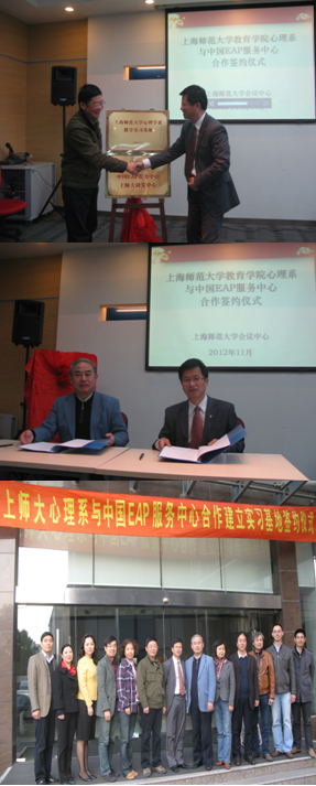 2012年11月15日,教育学院心理系与中国EAP服务中心就合作建立实习基地及研发中心于会议中心举行签约仪式,校教务处及院系多位领导,中国EAP服务中心总裁朱晓平博士、两位副总裁及市场部经理出席了此次仪式。教育学院院长陈永明教授与中国EAP服务中心朱晓平先生分别代表上师大教育学院和中国EAP服务中心签署了合作协议。教务处王旭川副处长与对方公司进行了隆重的揭牌仪式。