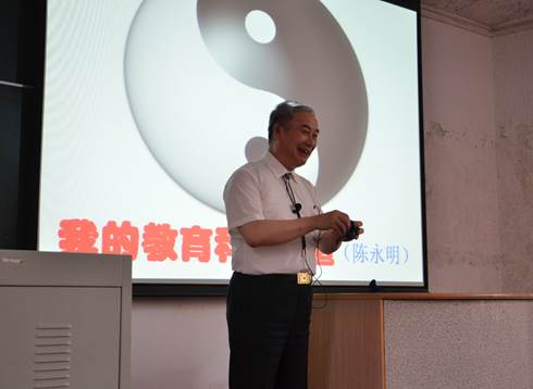 陈教授先从论“道”为出发点,诠释我国自古以来“道”字深刻内涵,从“圆形文化与思维方式”讲到“东西文化差异”,再讲到“东西文化与思维逻辑运作之差异”,然后列举“定向思维与逆向思维”、 “求同思维和求异思维”的利弊得失。接着,陈教授谈到教育教学的“三个中心”(教师、课堂、教材)及其教育改革。陈教授以三个时代对“苹果”(亚当夏娃偷吃的禁果、牛顿的苹果以及乔布斯的苹果等)的认知及作为,说明探索与创新对促进人类社会发展的重要性。最后,陈教授从农耕时代文明、工业时代文明讲到如今的信息时代文明,与时俱进地论述“我的教育科研观”。